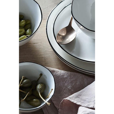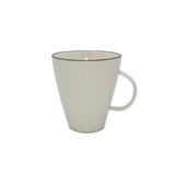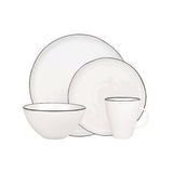 Hand glazed porcelain. Hand painted color rim in black. Set includes 1 dinner plate, 1 salad plate, 1 bowl and 1 mug. Microwave safe. Dishwasher safe, hand wash recommended to ensure quality of colored rim.