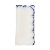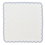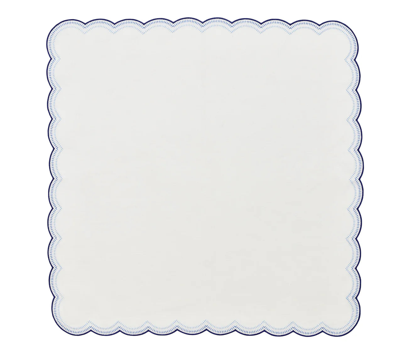 The Lune Napkin is playful with crescent swirls, echoing the curves of round tables and sculptural tabletops. Fine embroidery traces the scalloped edges in layered shades of navy, sapphire, and soft sky blue. Pair with the matching placemat and a sophisticated napkin ring to create an unforgettable table setting.