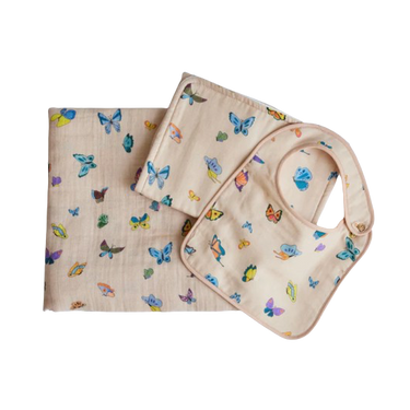 Something beautiful for mom and baby. Our Shawl Blanket, Perfect Bib and Burp Cloth, all in our Blush Peach Madame Butterfly motif.