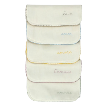 Our set of five organic cotton burp cloths are backed in our buttery soft, absorbent velour terry with a printed muslin front. The word “love” is embroidered at the bottom in five different languages and colors, with a coordinating picot trim. Made for baby boys and girls alike, this set is a newborn essential, a wonderful gift for parents-to-be.