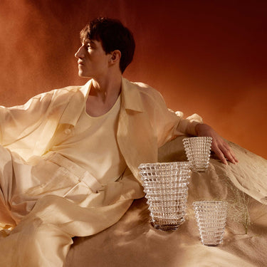 The extraordinary craftsmanship—horizontal bevel cuts on the outside and vertical bevel cuts on the inside produces a brilliant optical effect, rendered all the more intricate in the light. The Eye Vase maximizes the unpredictability of perception, evoking delight and surprise about what the eye can discern with shifts in luminosity.