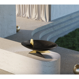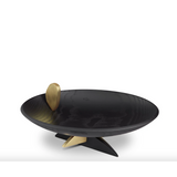 This provocative footed serving bowl is sculpted in ebonized European oak and adorned with brass accents; it embodies the sophisticated artistry of the L'Objet Kelly Behun collaboration.