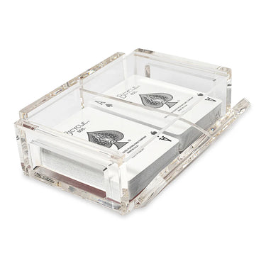 This open canasta tray has 2 sides to pull from, an opening for turn cards and a spinner. Great for play with 2 or 3 decks at a time. It comes with 2 decks of playing cards.