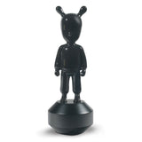 Black glossy porcelain figurine created by Jaime Hayon for the collection The Guest by LLadró Atelier with a black base attached to the piece.