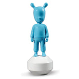 Blue glossy porcelain figurine created by Jaime Hayon for the collection The Guest by LLadró Atelier with a white base attached to the piece.