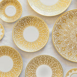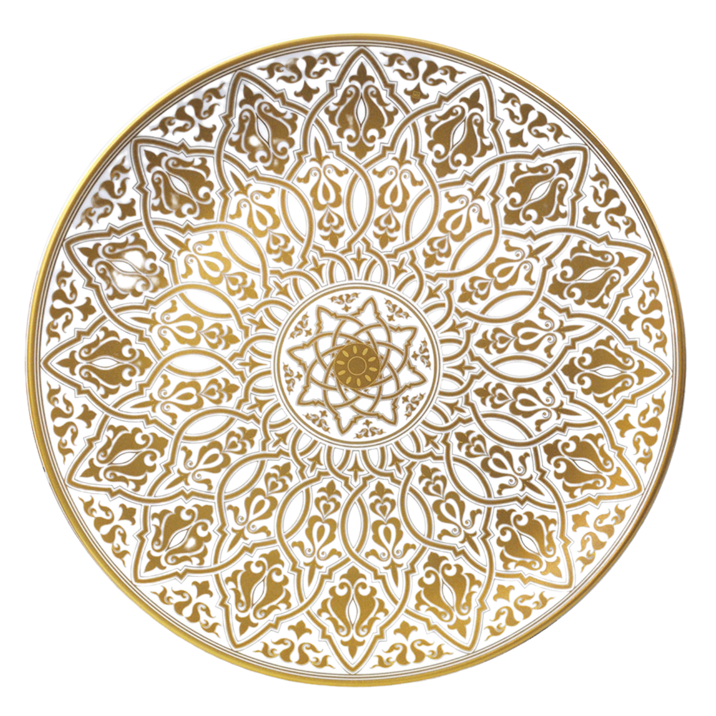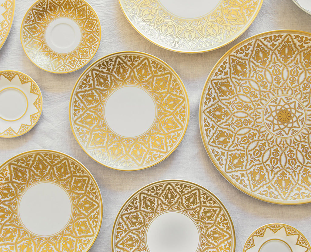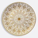 Venice's magnificent architecture and brocade textiles inform this stunning Bernardaud pattern. Wide 24K gold bands of pattern lend lavish detail to fine white porcelain. The service plate highlights the dinner plate that is placed on top.