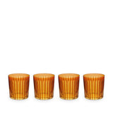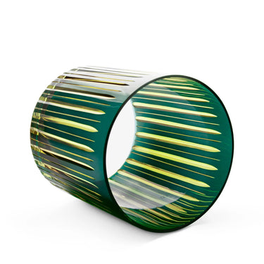 A glassware collection of bold color combinations, hand-cut and decorated to playfully reflect light. Available in Amber, Green, Purple, and Bordeaux.