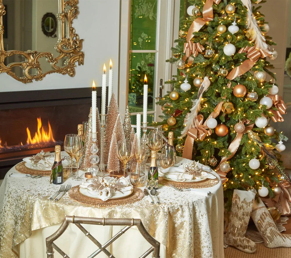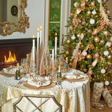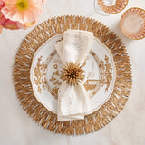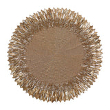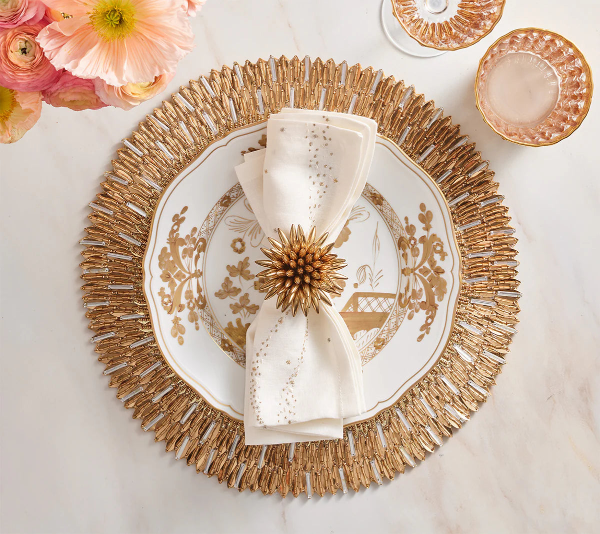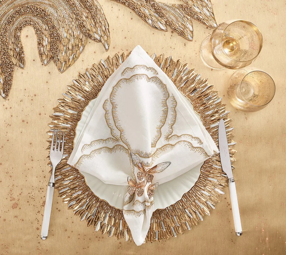 Layered gold sequins radiate from a beaded center on the magnificent Ray Placemat. Hand-applied feather-like sequins mimicking beams of golden sunlight beautifully frame the dinner plate. Seven variations of beads pepper this placemat, adding depth and sparkle. Complete this sophisticated look with the Ray Table Runner.