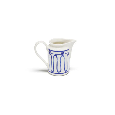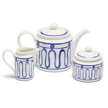 Handcrafted tea set in fine porcelain adorned with hand-painted Kyma pattern in blue.