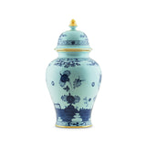 Iris Potiche vase in porcelain from the Oriente Italiano collection. It is distinguished by a blue decoration that centers around the celebrated carnation floral motif in contrast to the iris blue painted porcelain. Gold surrounds the design extending all the way to the pommel on the lid.