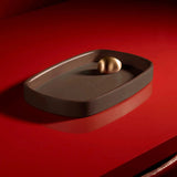 The Pebble Accessory Tray is an exciting combination of texture and form. Made from red pebbled leather with walnut wood edges, it exudes both elegance and warmth. The tray features a unique brushed brass rock-shaped piece, magnetically attached to help organize your favorite items. With its rounded corners, this artisanal tray offers an unexpected touch to any space, inviting you to keep your treasures beautifully organized.