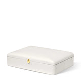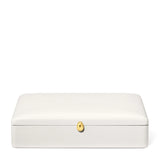 Keep a desk or vanity table organized with this beautiful box presented in Italian grained leather. Rounded corners and a cushioned, hinged lid provide a contemporary touch, while an organically shaped brass handle is a stylish accent. This piece is lined with moire fabric for easy cleaning.