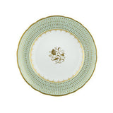 Darley Abbey captures the regency style of restrained simplicity using delicate lines and intricate curves representing twirling foliage and filigree leaves. The carefully placed ornamental elements combined with the gold glistening against the soft green silk damask background makes the pattern dance_ around the tableware.