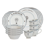 A collection created for lovers and dreamers alike, and inspired by French cafés and English countryside picnics, this chic black, white, and blue set features our hand-sketched hot air balloons and hearts to symbolize a life filled with romantic adventure. This 16 piece set provides service for four and includes 4 dinner plates, dessert/salad plates, cereal/ice cream bowls and cofftea cups.