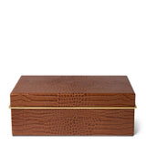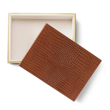 Keep a table or bookshelf organized with this beautiful lidded box presented in croc embossed Italian leather edged in brass. Lined in micro suede, it holds smaller items, from jewelry to keys. A sophisticated way to keep an office in order.