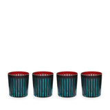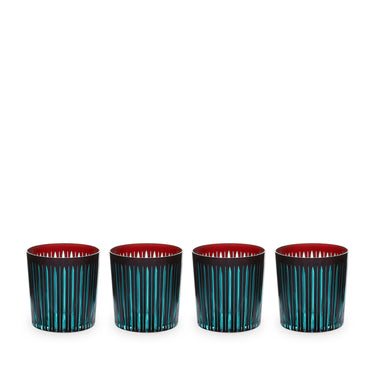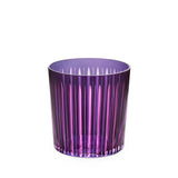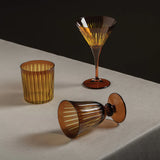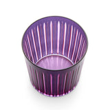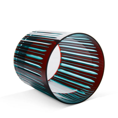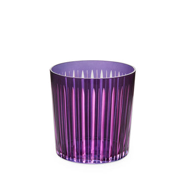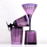 A glassware collection of bold color combinations, hand-cut and decorated to playfully reflect light. Available in Amber, Green, Purple, and Bordeaux.