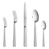 The five-piece stainless steel place setting for one person in the Hudson design contains all the dining essentials including a tablespoon, dinner fork, serrated dinner knife, dessert fork and coffee spoon.
