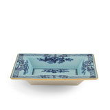 Iris rectangular change tray in porcelain with threading in gold from the Oriente Italiano collection. It is distinguished by a deep blue carnation floral motif on iris blue porcelain. Lustrous hand-painted gold threading enhances the classic and sleek contours for a design that is readily distinguishable and the distinctive signature of the Collection can be found on the back.