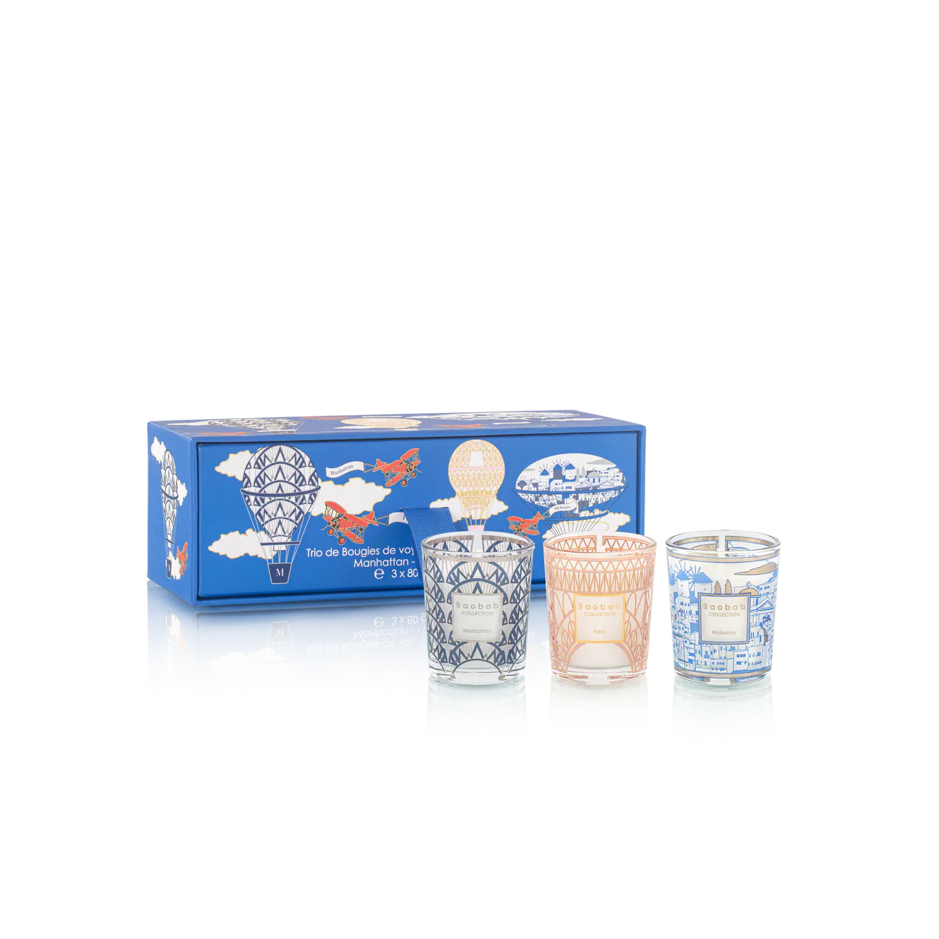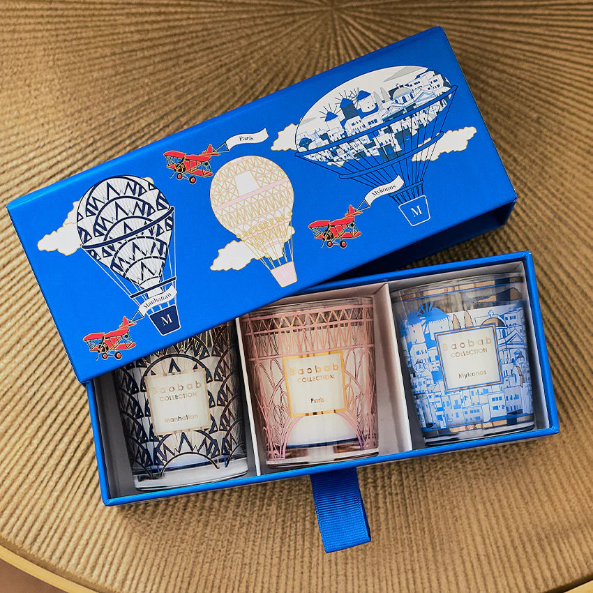 Experience the magic and indulge in the unforgettable journey of Baobab Collection's Trio Travel Candles! Take a multi-continental adventure with Manhattan, Paris, and Mykonos all in one trio box. The "Mykonos" blue box will have you dreaming of lazy days in the Cycladic sun and gastronomic memories of Paris. Each candle radiates a delightful scent and looks to transform your home. Nothing can compare to the experience of travelling, but Trio Travel Candles will take you away for a uniquely unforgettable experience.