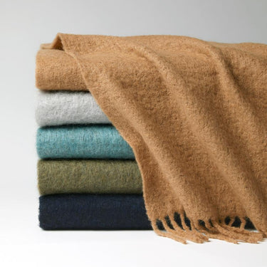A downy, Alpaca-blend throw woven into a bouclé texture lends a cozy and tranquil feel.