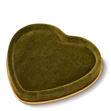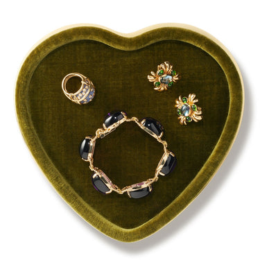 A luxurious, heart-shaped tray covered in velvet, further enhanced with brass edging. It looks beautiful on a desk but works equally well as a way to keep personal items organized on a vanity. The heart shape, a central motif in the AERIN brand, makes it an ideal gift for a loved one.