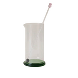 A borosilicate glass mixer, with a heavy, colorful base and contrasting stir stick. Perfect for making cocktails, juices, or as a simple pitcher.