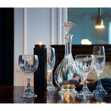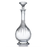 The decanter features an acutely textural aspect, resulting from the artful and scrupulous lines etched into the corridor between the neck and orb-like base of the decanter. This, in turn, puts the surface smoothness on each side of the neck in sharp relief. The decanter is topped with an exquisitely crafted stopper cut like a diamond. The Massena decanter is part of the larger Massena Clear crystal bar set, which includes wine glasses, flutes, and tumblers, each of which share the decanter’s meticulous textural qualities.