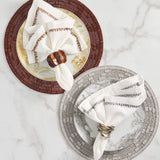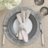 The artisanal Matrix placemat is hand-crafted using captivating gray glass beads. This unique beadwork gives the placemat a ceramic-like appearance. Beads of varying heights create an engaging high and low effect on a ringed border. This textured border features a captivating, repeated pattern. The transitional Matrix placemat combines style and function for spring and summer entertaining.