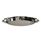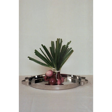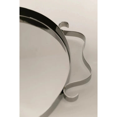 A mirror polished stainless steel serving tray, with two soft, wavy, ribbon-like handles. This tray is ideal for serving drinks or appetizers, coffee or tea, or simply as a decorative catch all.