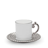Porcelain espresso cup with ornate handle and saucer hand painted with Aegean wave motif in 24K gold, platinum, or white. Inspired by the Greco-Roman treasures of the ancient world, reimagined for contemporary tables.