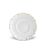 Tableware from L'Objet Haas Brothers collaboration- porcelain saucer featuring an intricate and organic pattern reminiscent of desert pebbles and of the endless stars in the desert sky.