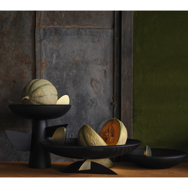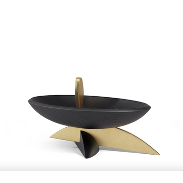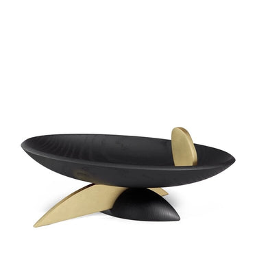 This provocative footed serving bowl is sculpted in ebonized European oak and adorned with brass accents; it embodies the sophisticated artistry of the L'Objet Kelly Behun collaboration.
