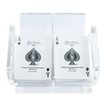This open canasta tray has 2 sides to pull from, an opening for turn cards and a spinner. Great for play with 2 or 3 decks at a time. It comes with 2 decks of playing cards.