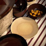 The porcelain Terra bread and butter plate is hand-crafted and glazed in our Portuguese atelier. Its organic shape is refined with glazed finishes that bear the idiosyncrasies of their namesake materials: wine, leather, stone, iron, and seafoam.