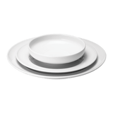 A complete set of elegant and functional dinnerware plates in white porcelain, first designed in the 1960s by acclaimed Danish designer Henning Koppel, a longtime Georg Jensen collaborator.