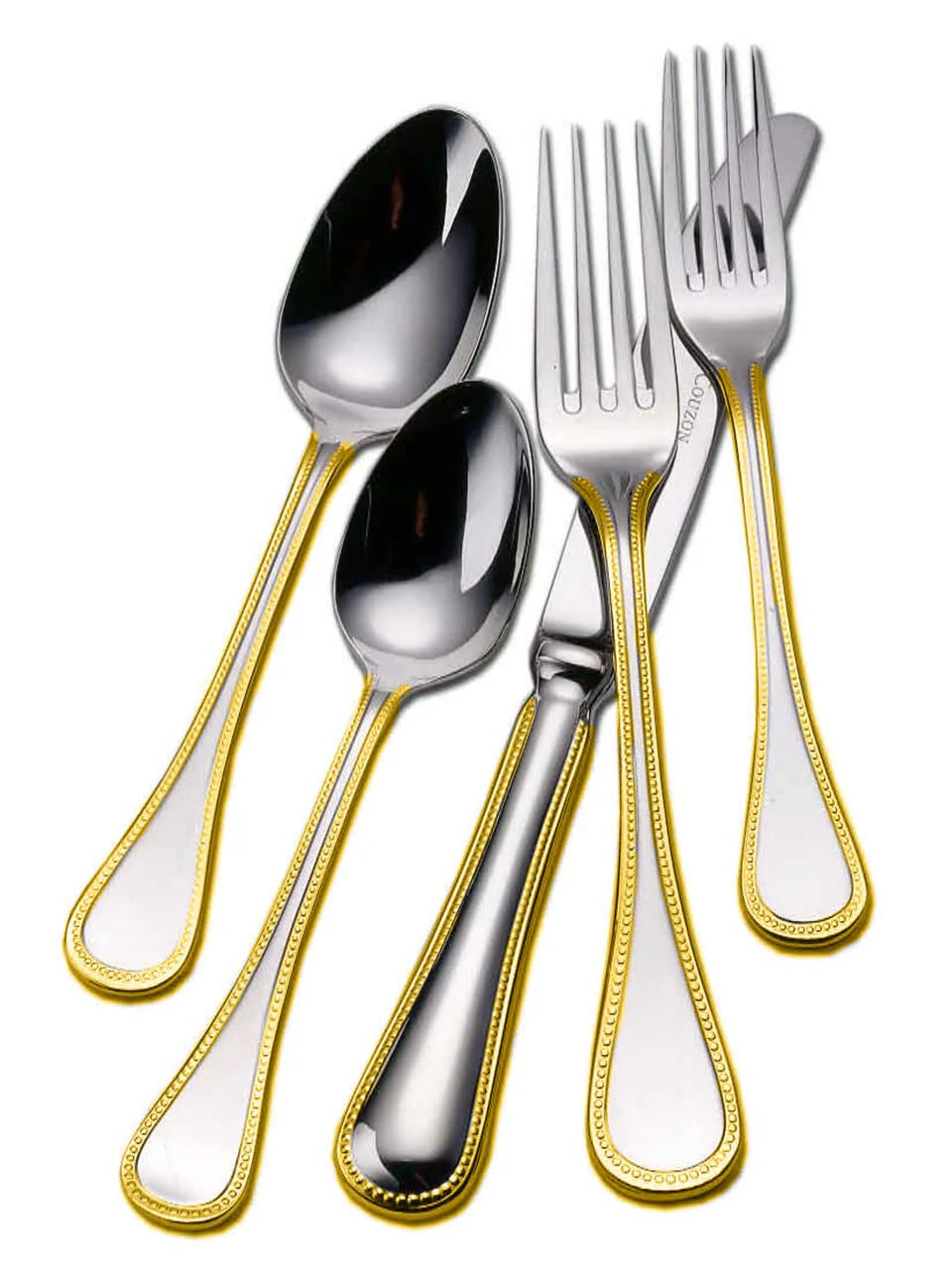 Elevate your dining experience with this exquisite 5-piece flatware set, crafted from durable 18/10 stainless steel and adorned with delicate gold pearls along the border. This best-selling pattern effortlessly combines timeless tradition with a touch of refined luxury. Its versatile design makes it the perfect companion for any table setting, from casual meals to formal gatherings. Let the subtle elegance of the gold pearls add a moment of sophistication to every bite, turning everyday dining into an occasion to cherish. Classic, yet distinctive—this flatware set is the epitome of enduring style. Each set includes table fork, table knife, teaspoon, dessert spoon, and dessert fork.