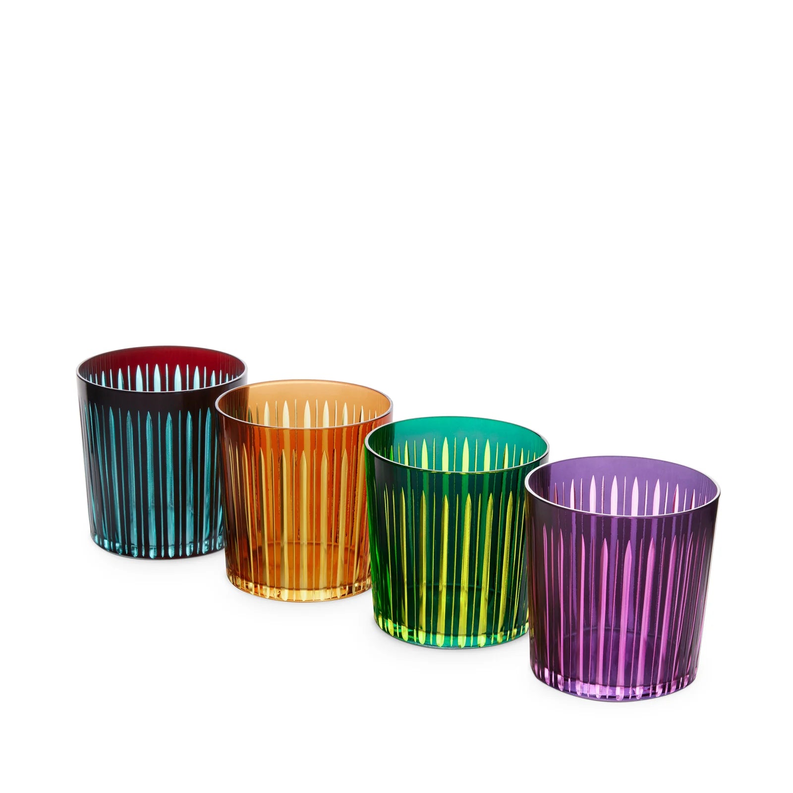 A glassware collection of bold color combinations, hand-cut and decorated to playfully reflect light. Set includes 1 each of Amber, Green, Purple, and Bordeaux.