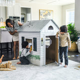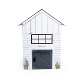 We make playtime fun – and cute! Meet the Modern Farmhouse Playhouse, where rustic charm meets a chic design, welcoming endless days of imaginative play. Enjoy a picturesque facade that goes with your own home interiors with classic white siding, sleek black-framed windows, and a chic metal-seamed roof. Turn up the cute with hand-illustrated plants on limestone walls and darling herbs nestled in terracotta pots, while brass and iron fixtures and hardware add an extra touch of charm. Peek inside to find dazzling white oak plank flooring arranged in a fancy herringbone pattern that's just begging for a dance party!