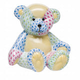 This hand painted teddy bear is an ideal gift for any baby shower or child’s birthday. This bear shows patterns patched together to give a fun quilted look to bring color to any room. All designs are hand painted by artisans.