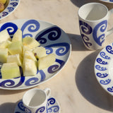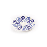 Handcrafted dessert plate in fine porcelain adorned with hand-painted Peacock pattern in two-tone blue.