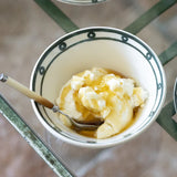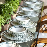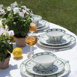 Handcrafted bowl in fine porcelain adorned with hand-painted Kyma pattern in green.