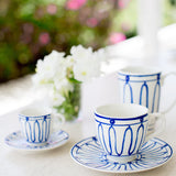 Handcrafted espresso cup & saucer in fine porcelain adorned with hand-painted Kyma pattern in blue.
