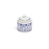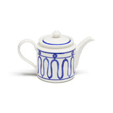 Handcrafted tea set in fine porcelain adorned with hand-painted Kyma pattern in blue.