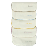 Our set of five organic cotton burp cloths are backed in our buttery soft, absorbent velour terry with a printed muslin front. The word “love” is embroidered at the bottom in five different languages and colors, with a coordinating picot trim. Made for baby boys and girls alike, this set is a newborn essential, a wonderful gift for parents-to-be.