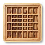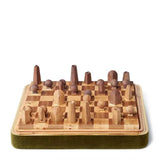 Beautifully presented in a plush velvet box with brass detailing, styled with rounded corners to reflect the soft finish, this chess set is ideal for gifting. It has been given a contemporary twist, with streamlined chess pieces presented in walnut and oak elevated with brass plate bases engraved with the AERIN logo. The removable board, crafted in burlwood, sits in a case finished in bird’s eye maple.