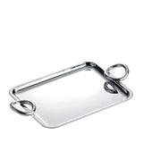 The Vertigo silver-plated rectangular tray is adorned a two circular rings.