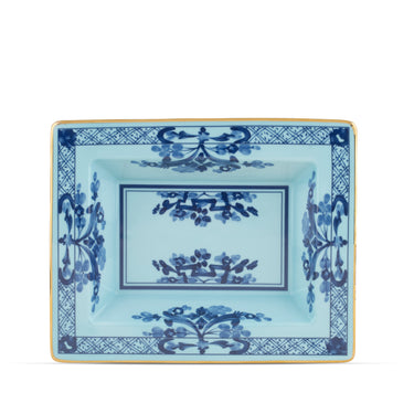 Iris rectangular change tray in porcelain with threading in gold from the Oriente Italiano collection. It is distinguished by a deep blue carnation floral motif on iris blue porcelain. Lustrous hand-painted gold threading enhances the classic and sleek contours for a design that is readily distinguishable and the distinctive signature of the Collection can be found on the back.