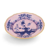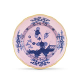 Azalea dessert plate in porcelain with gold threading from the Oriente Italiano collection. The celebrated carnation motif stands out in blue against the contrasting azalea pink of the porcelain. The exquisite hand-painted gold threading illuminates the design, tracing the contours of the Antico Doccia shape, classic and versatile, as it brings together Italian artisanal traditions and Oriental appeal.