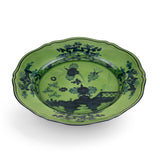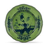 The decoration features the well-known carnation floral motif, in a shade that contrasts with the deep malachite green. It spans the center of the historic Antico Doccia shape, creating a refined overall design for coordinated mise en place.