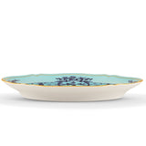 Iris oval platter in porcelain with gold threading from the Oriente Italiano collection. It is set apart by a contrasting blue carnation design on a background of porcelain colored iris blue. Gold threading frames the decoration and enhances the contours of the classically elegant Antico Doccia shape.